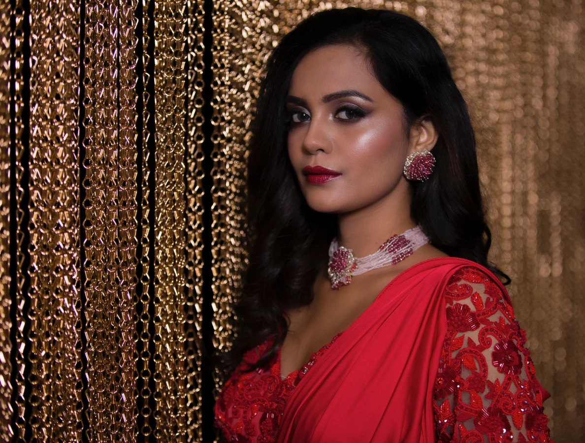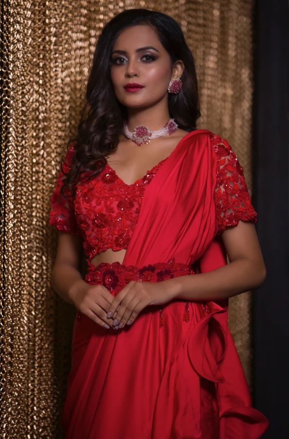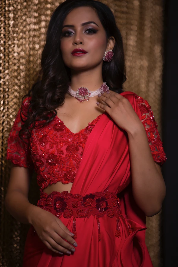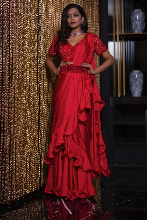 A fiery red-on-red masterpiece, the aria drape saree features delicate hand embroidery that shimmers subtly against its rich base. Fluid ruffles flow with every step, adding a modern flair to this timeless silhouette — a statement piece that balances drama and elegance effortlessly.