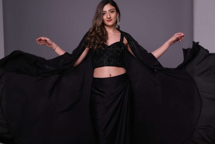 A versatile three-piece set featuring a draped skirt, embroidered cape jacket, and classic black corset. Each piece can be worn individually or styled together for a bold, elegant look.