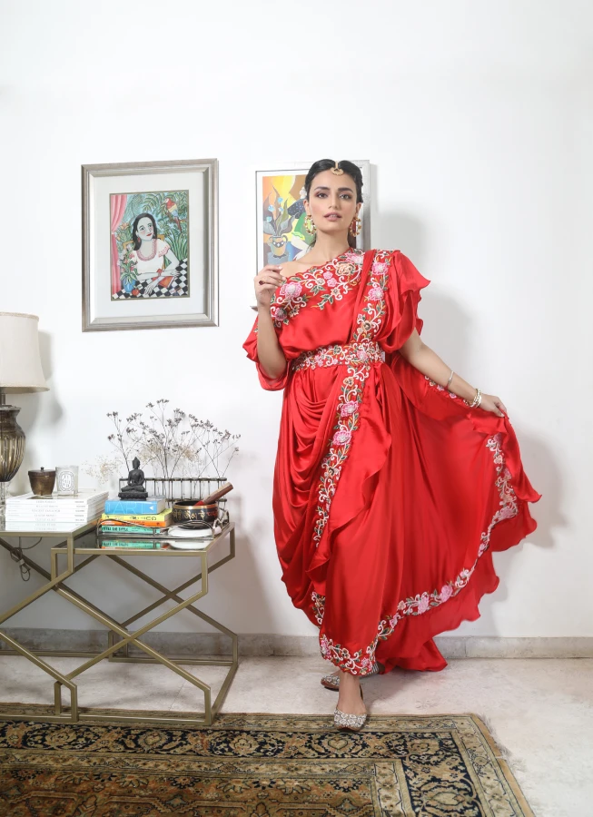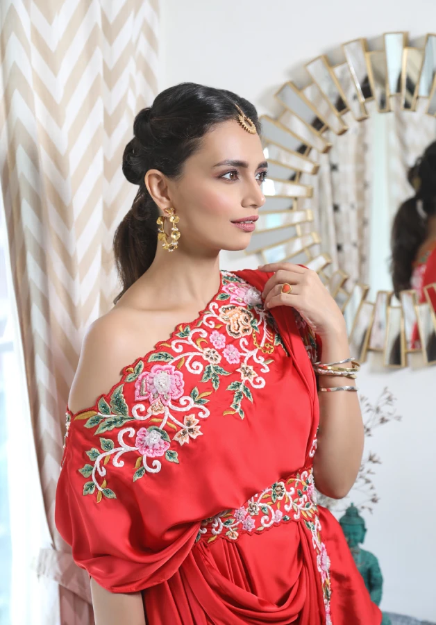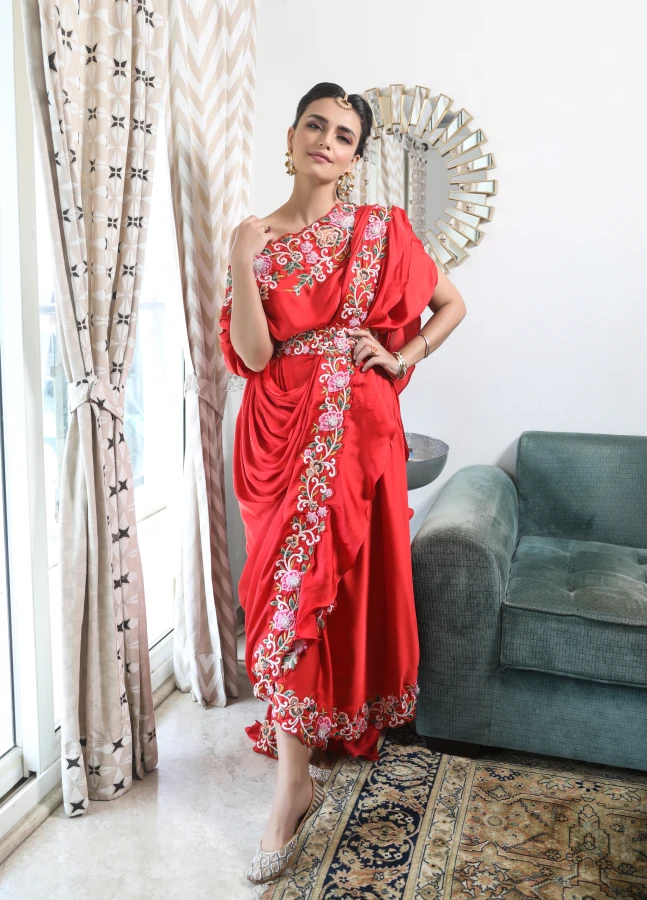 Crafted from rich silk satin fabric, this saree drapes like a dream, offering a soft, luminous sheen that exudes opulence. The silk satin’s smooth texture caresses the skin, while its natural fluidity creates a graceful silhouette that flatters every figure.